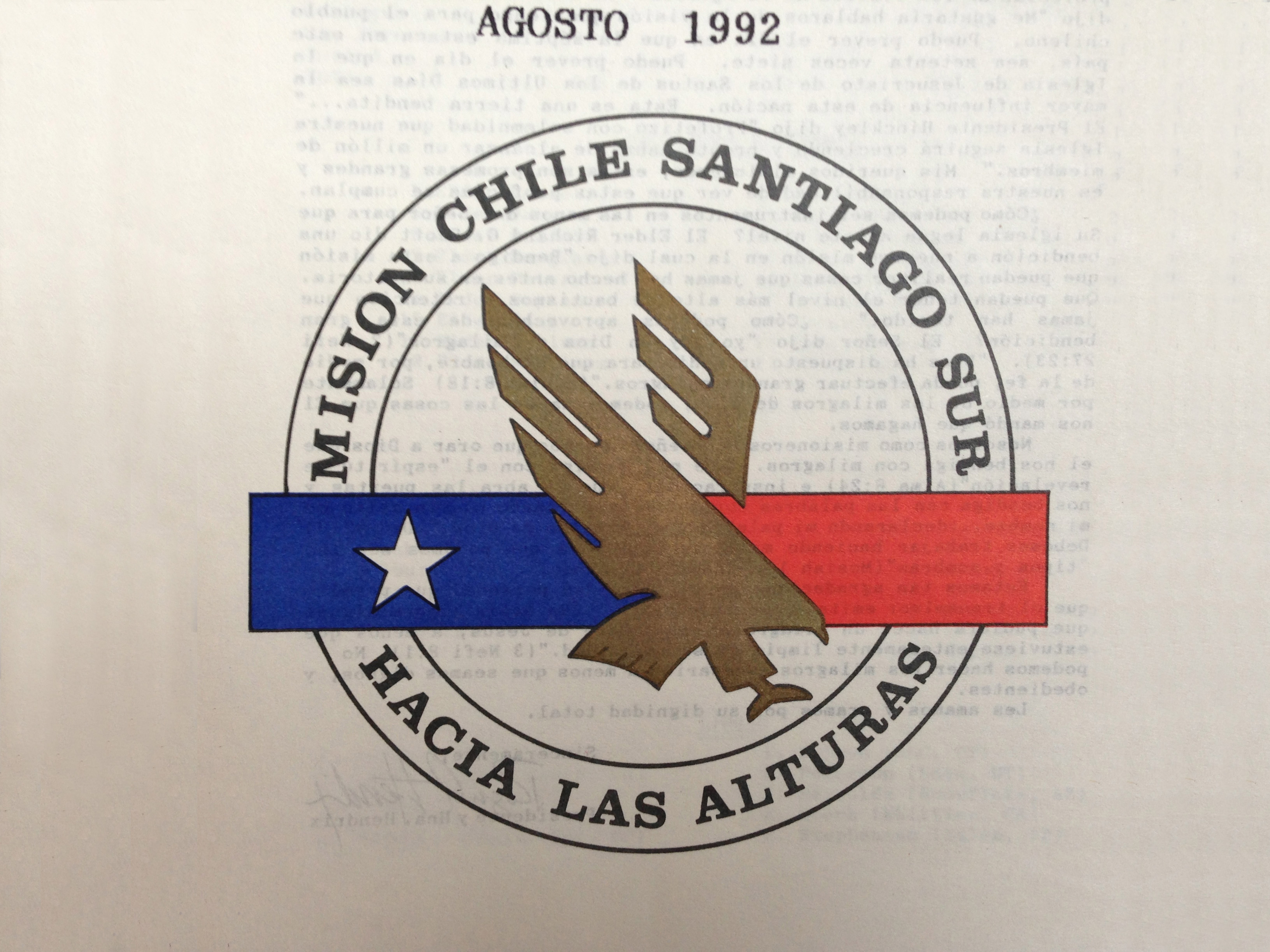 As I made my way to the lower-middle-class suburb of Santiago where I was to labor for the next three months, it occurred to me that I had very little in the way of time or material to actually execute such an assignment. We did missionary work 14 – 16 hours a day, seven days a week, with only one morning dedicated to personal time. This was still pre-Macintosh and the only art supplies I had were the colored pencils that I used to highlight verses of scripture. But I forged ahead, and created a hand-drawn logo that included, at my president’s request, an eagle — combined with an abstract Chilean flag and the phrase “Hacia las alturas,” which translates as “Toward the heights.”