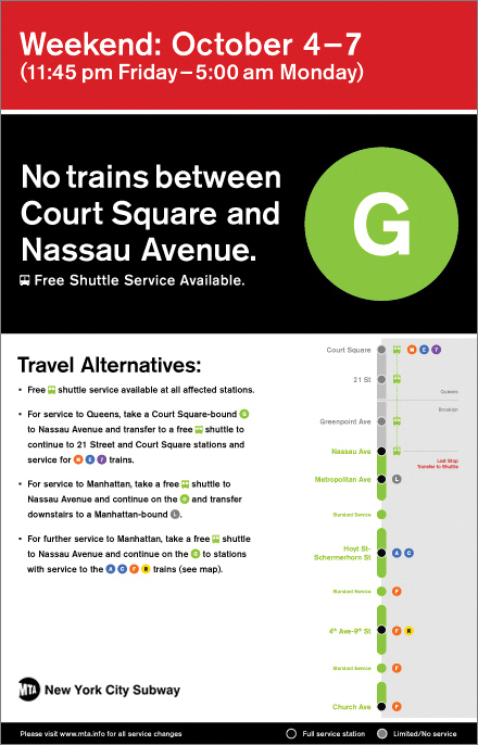 Next, I modified the “Weekend” heading. Rather than bold or capitalize certain headings, I tried to state the essentials — the time and date, the train line(s) and stations affected, and travel alternatives — in a clear and consistent manner.
