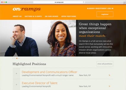 On-Ramps is a leading executive search firm in the social sector. Thinkso designed the firm’s original identity and website back in 2007, and was brought in to refresh the site. To highlight the firm’s value proposition for both employers and recruits, we highlighted how On-Ramps was different from other recruiting firms and enticed candidates to go through the lengthy application process online.
