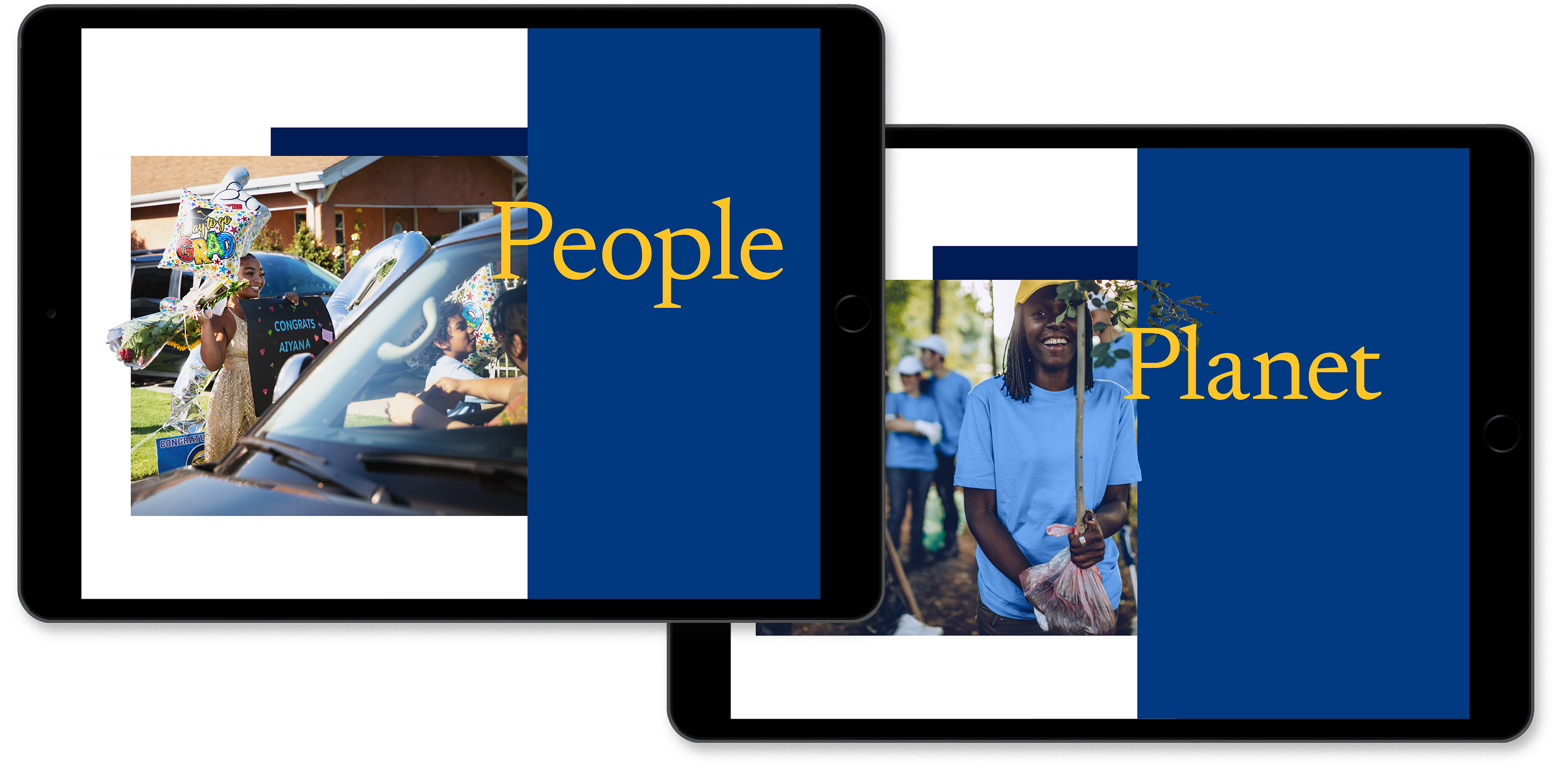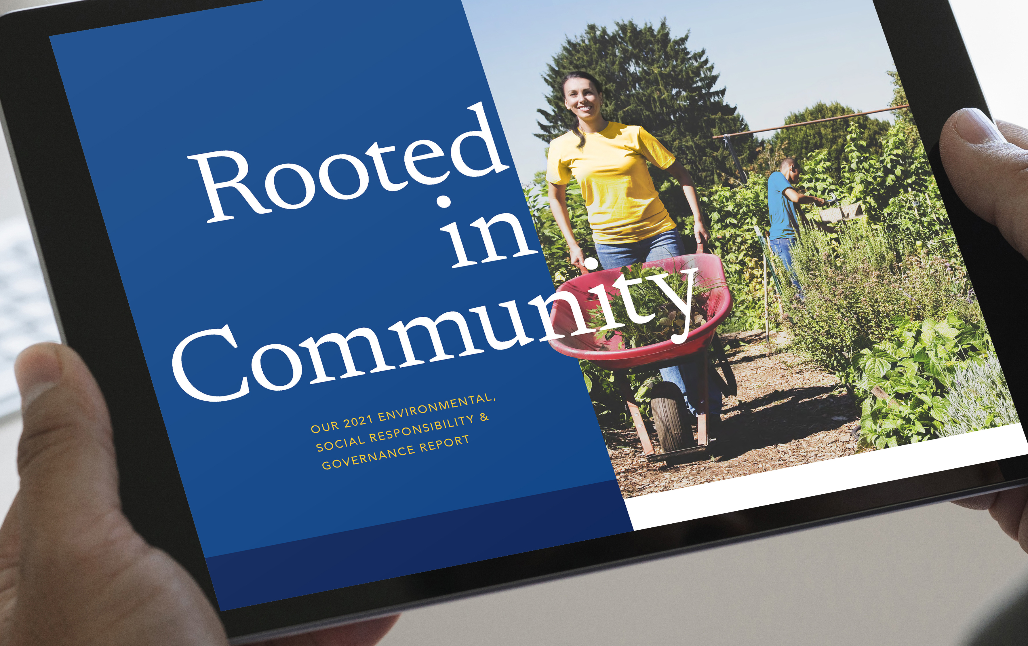 For example: When we recently worked on an ESG report for a leading consumer lender, we developed the theme “Rooted in Community.” It enabled us to use visuals that focused on team members from local branches as well as typical customers. We silhouetted them to break out of the frame, further emphasizing the idea that “our people and customers always come first.”