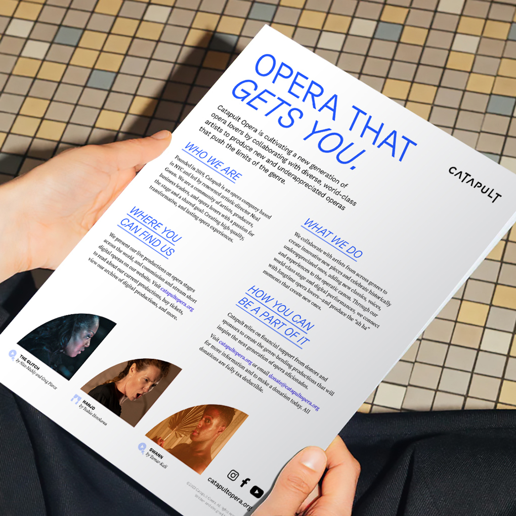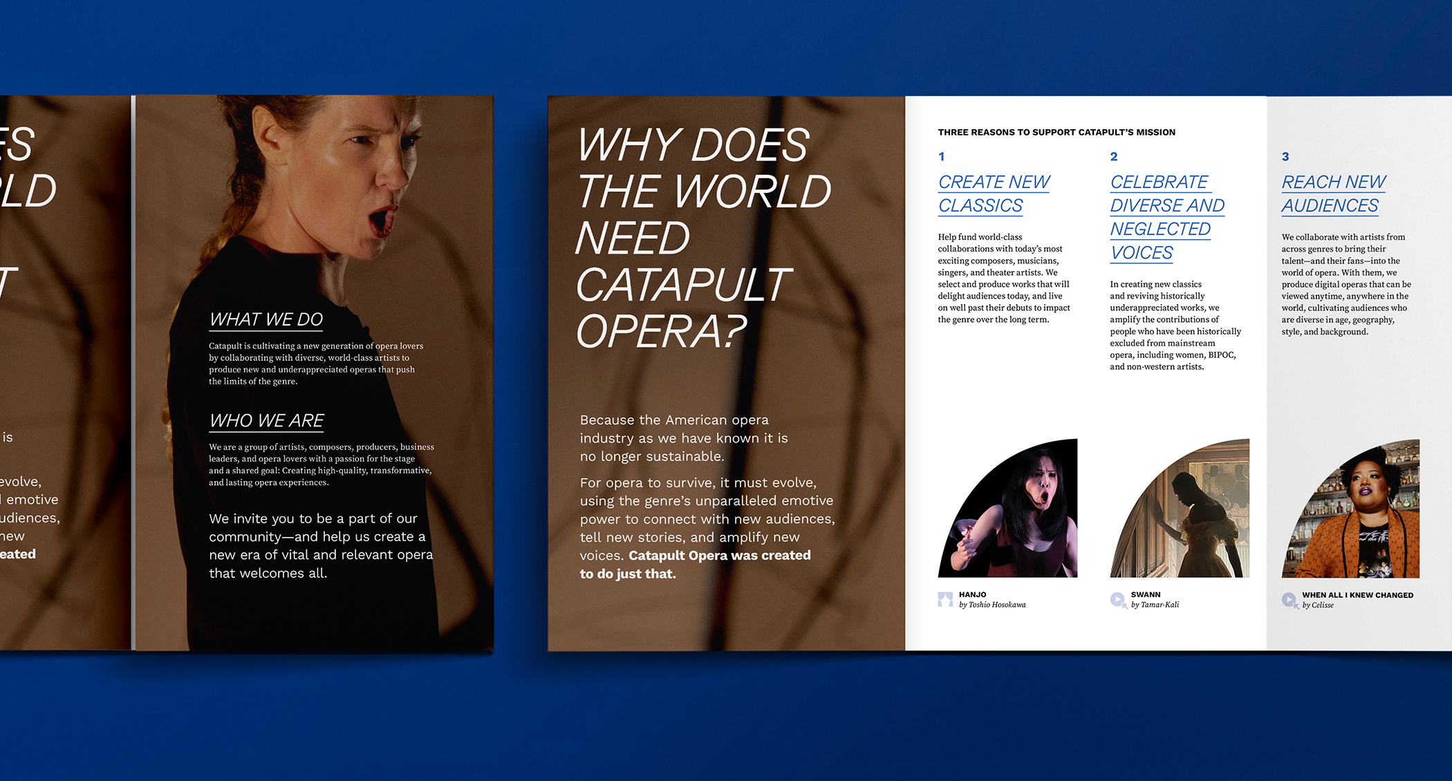 Raising Catpult’s profile with donors was a key objective of the rebrand. The donor brochure combines future-forward design with clear, compelling editorial to position the organization as a premier opera company — one that does not compromise on quality while opening up the canon and truly innovating.