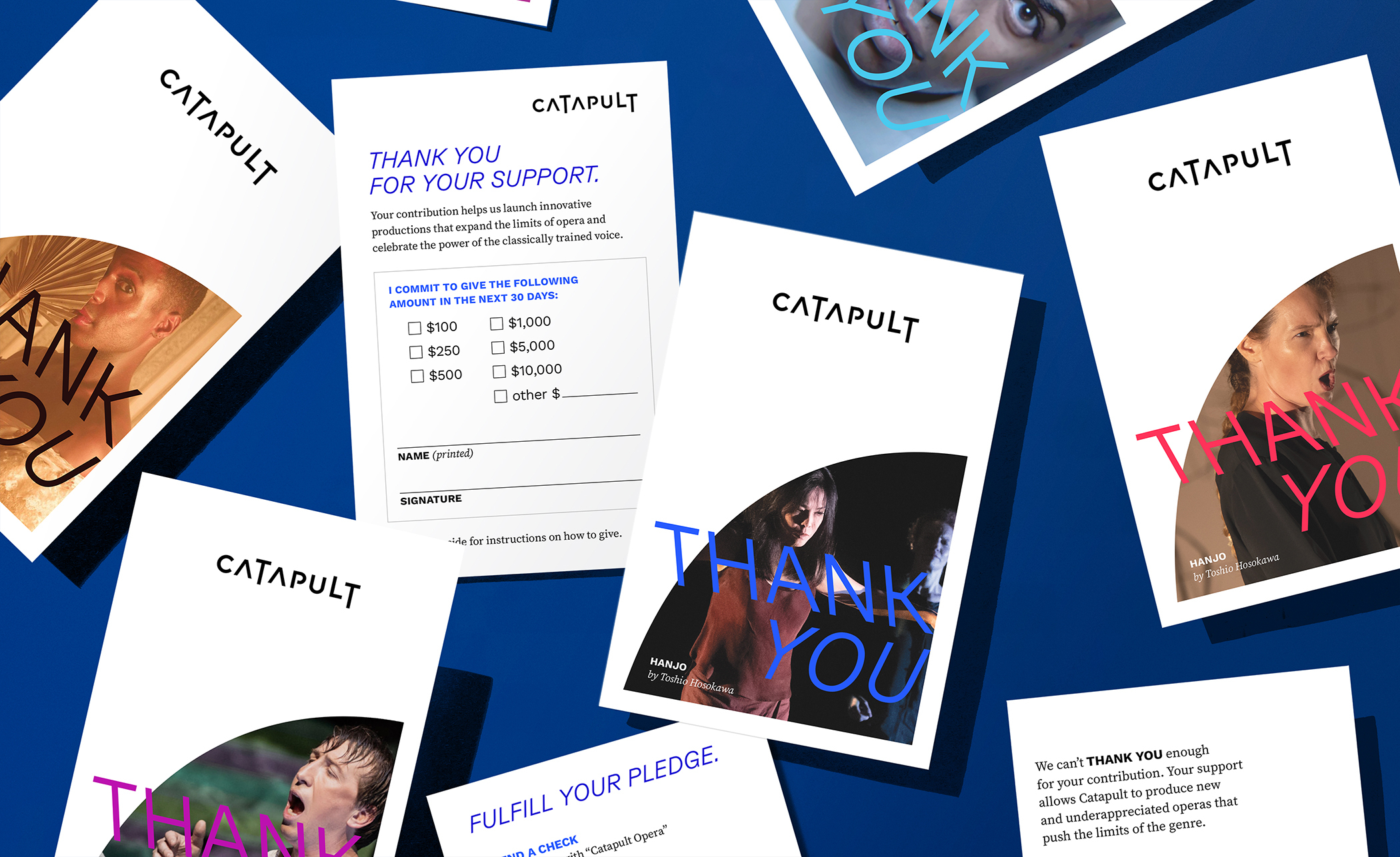 Catapult Opera has a bold mission: to secure the future of opera by expanding the genre and creating a new generation of opera lovers. But as a startup, its disjointed marketing, a clunky website, and a scant brand identity made it difficult to attract the institutional donors, established opera goers, and newcomers — the audiences the company needs in order to grow and thrive. Enter Thinkso. We rebuilt the brand from the ground up, refining the logotype and fleshing out a new visual and verbal identity designed to resonate with all audiences — and, importantly, signal a sophistication and depth that reflects the opera company’s artistic integrity.