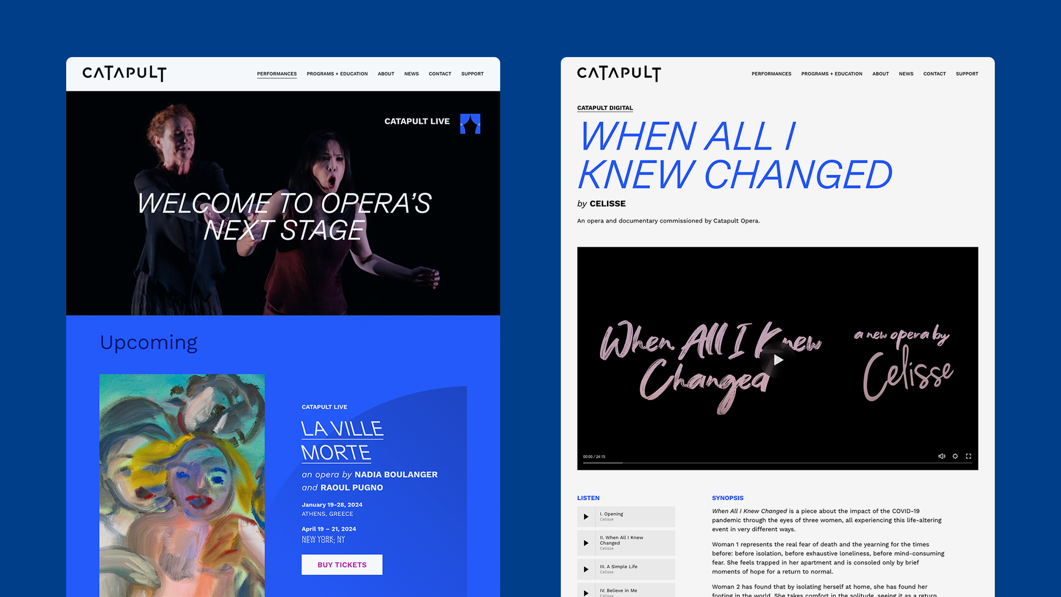 The website showcases the energized typography and prominent arc, animating it to reveal and frame artwork for the newest production. The user experience is tuned to the pulse of what’s new at Catapult, driving viewers to view short digital operas, plan to see a live performance, or dig deeper into what’s behind the scenes.