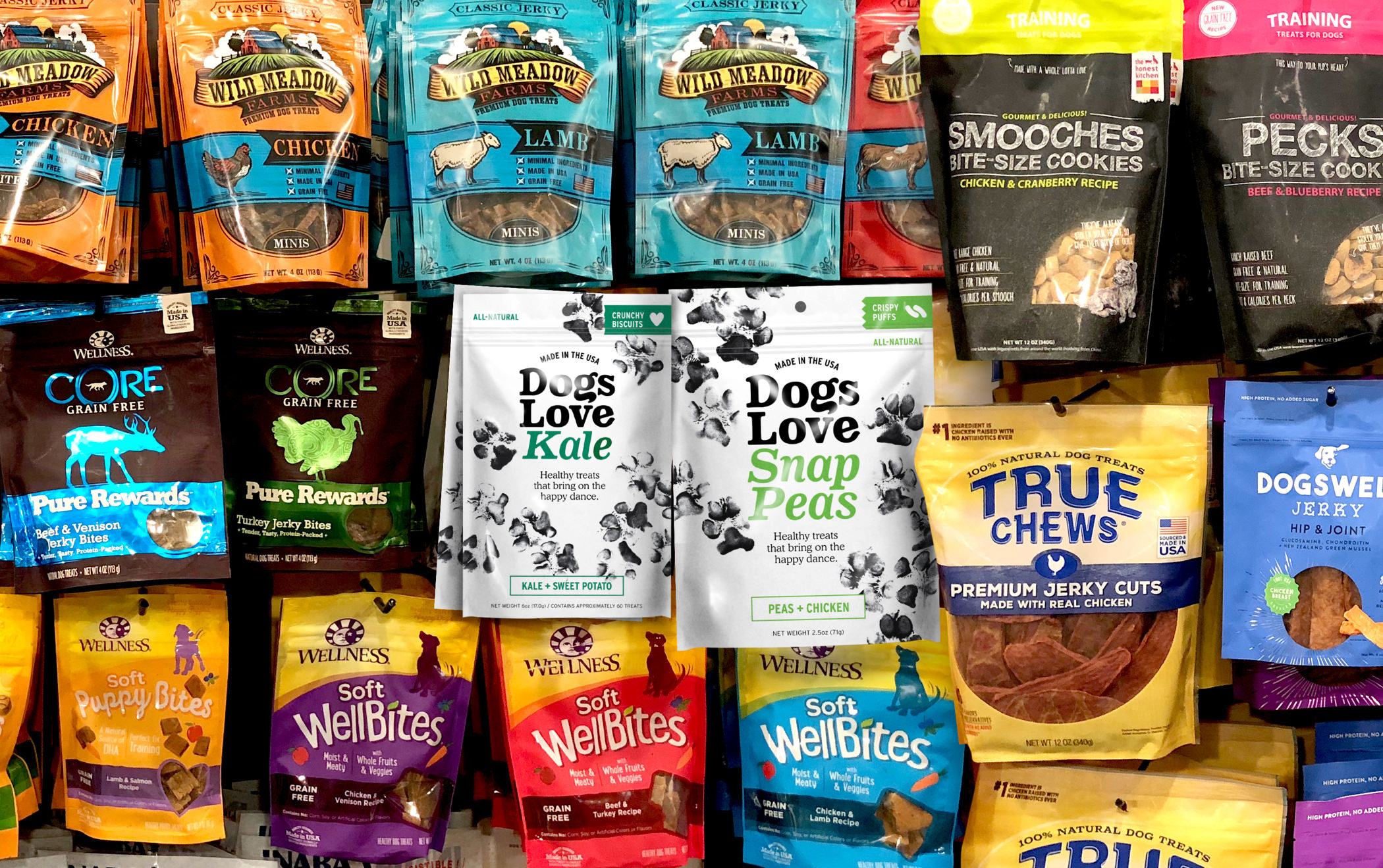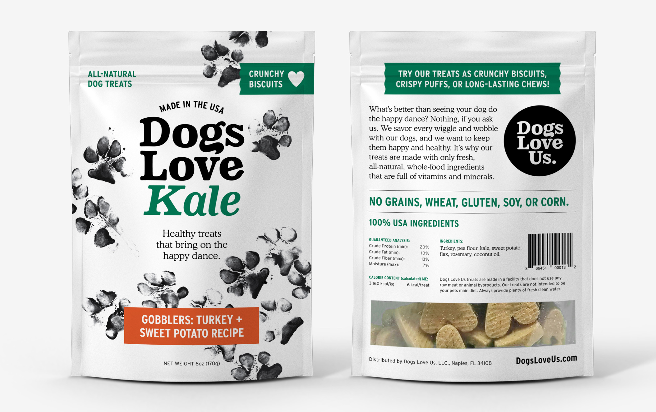 Dogs Love Kale, a Florida-based dog treats company, had carved out a unique niche for itself: super-healthy treats made with quirky ingredients such as kale, snap peas, and even hummus. To expand and clarify their offering, they tapped Thinkso to rebrand them as Dogs Love Us, organize the brand architecture, and design packaging that would help them better compete in an ultra-competitive category. The branding concept we developed celebrates the uncontainable feeling of excitement and emotion that dogs have at treat time, which we termed the “happy dance.” To illustrate it, we employed Fred, a pit bull rescue whose paw print artwork prances across the product line.