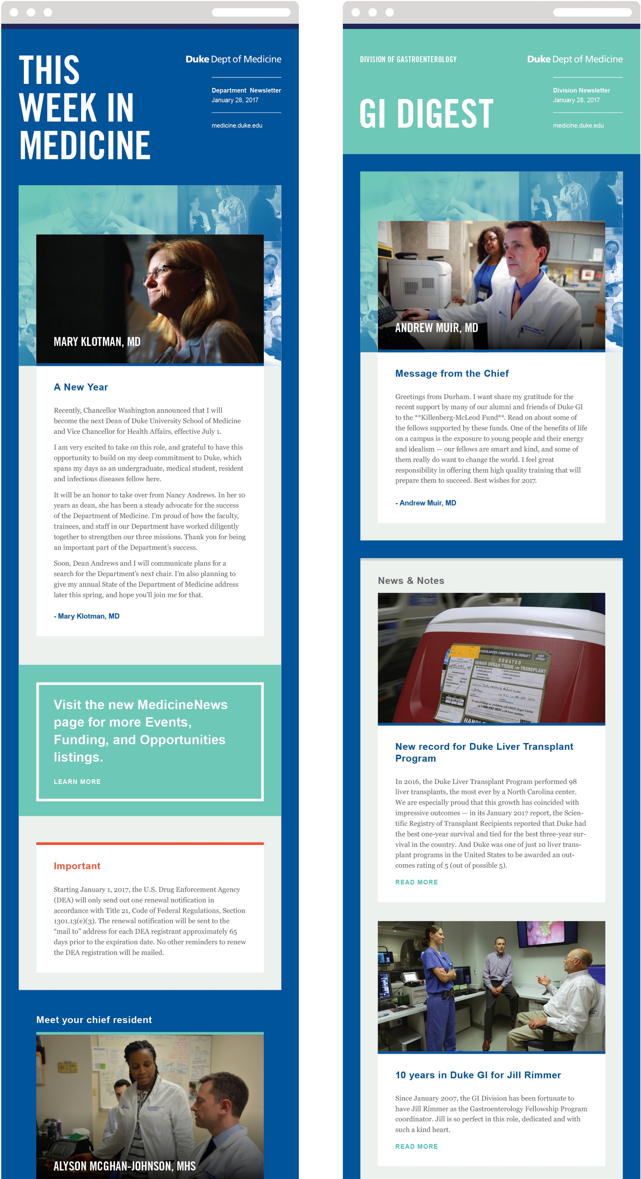 The new communications framework has empowered the department to connect with their constituencies with a newfound sense of style. Beginning with the announcement of former department chair Mary Klotman’s promotion to Dean of the School of Medicine, the weekly enewsletter, This Week in Medicine, has established itself as the go-to source for up-to-date departmental news. The 2017 Alumni Report set the standard for alumni communications and is proudly acclaimed as an example of creative collaboration between the department’s communications office and creative agency, Thinkso.