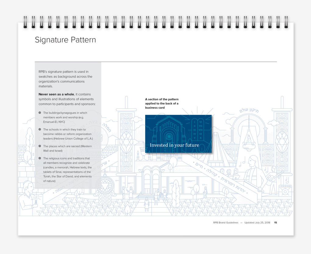 We designed a signature pattern for RPB and use it in swatches and as backgrounds across the organization’s communications materials. It contains symbols and illustrations related to RPB participants, including Reform Movement synagogues, Israeli landmarks, religious icons, and traditions.