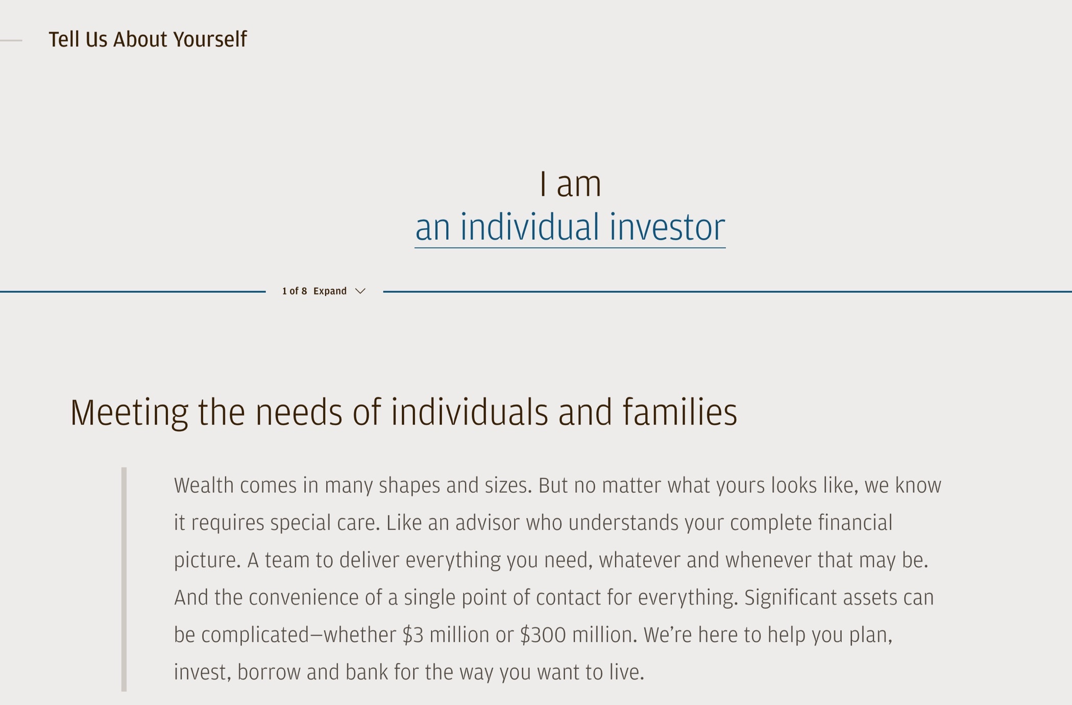Market research found that many potential clients had no idea what differentiates private banking from other wealth management or retail banking services. Here, and throughout the website copy, we helped define it and recast it for a younger, less formal audience.
