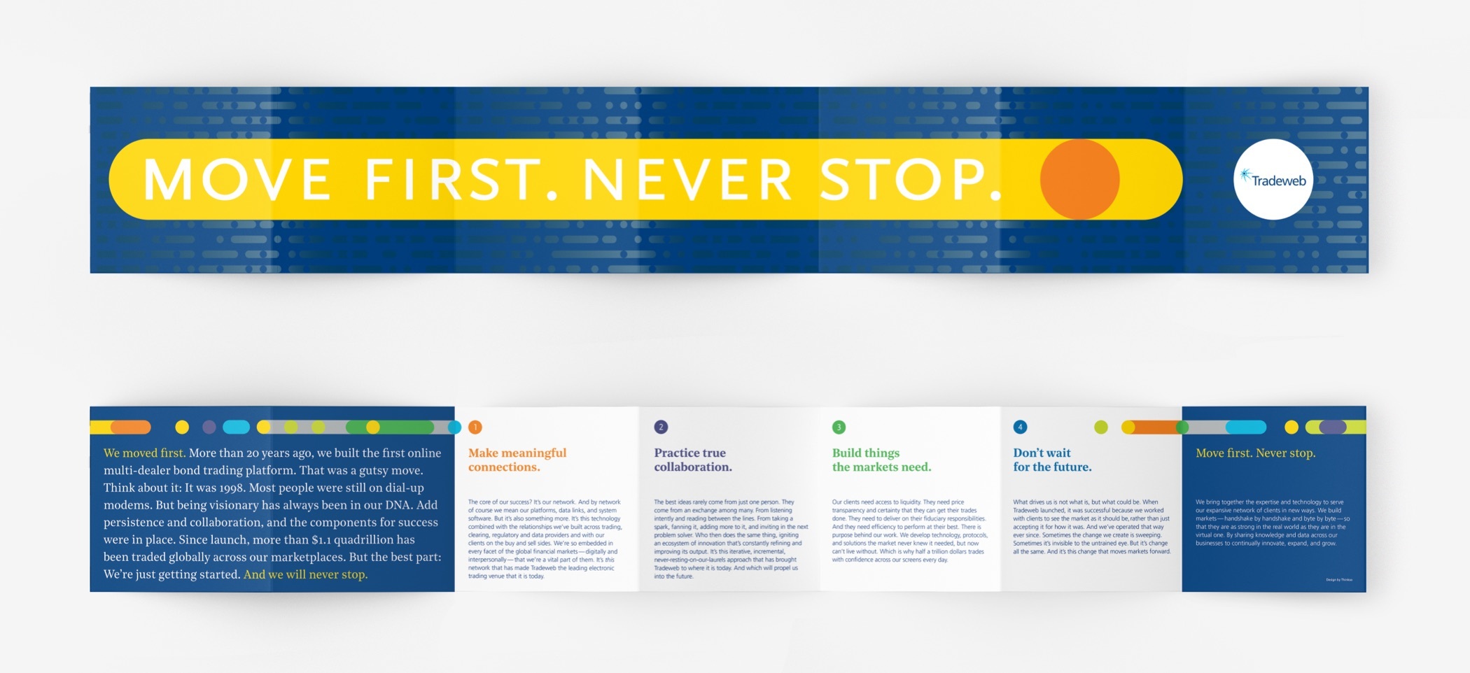 We created a unique employee takeaway that proudly celebrates the new campaign, tying it to the core values of the Tradeweb brand. Additional items such as pull-up banners rounded out the IPO materials.