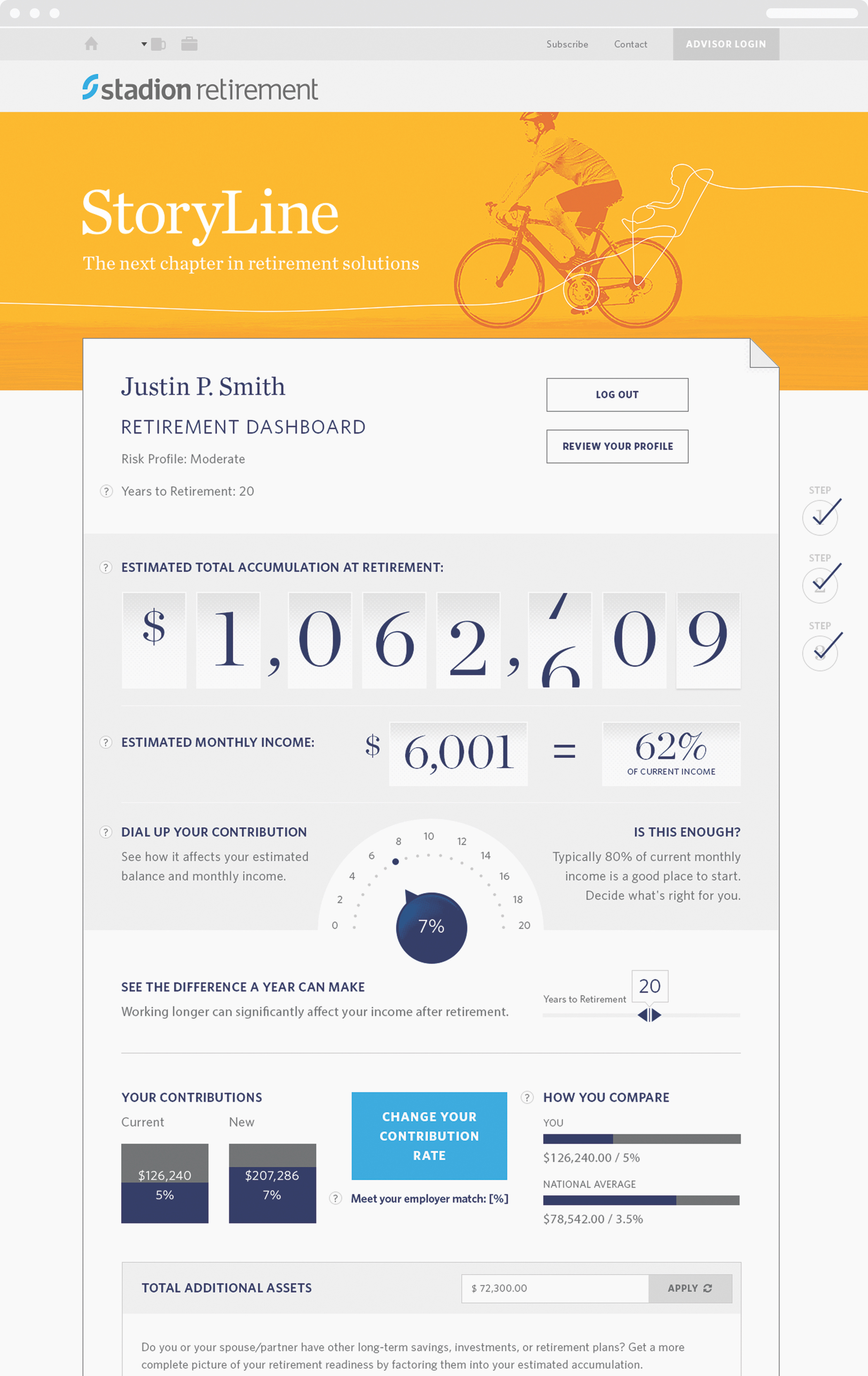 Stadion’s groundbreaking retirement product needed a website that guided new participants through a multistep customization process without losing them. Thinkso designed a site that gets users through the core product questionnaire quickly, and keeps them engaged with an easy- and fun-to-use interactive retirement savings dashboard.
